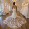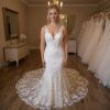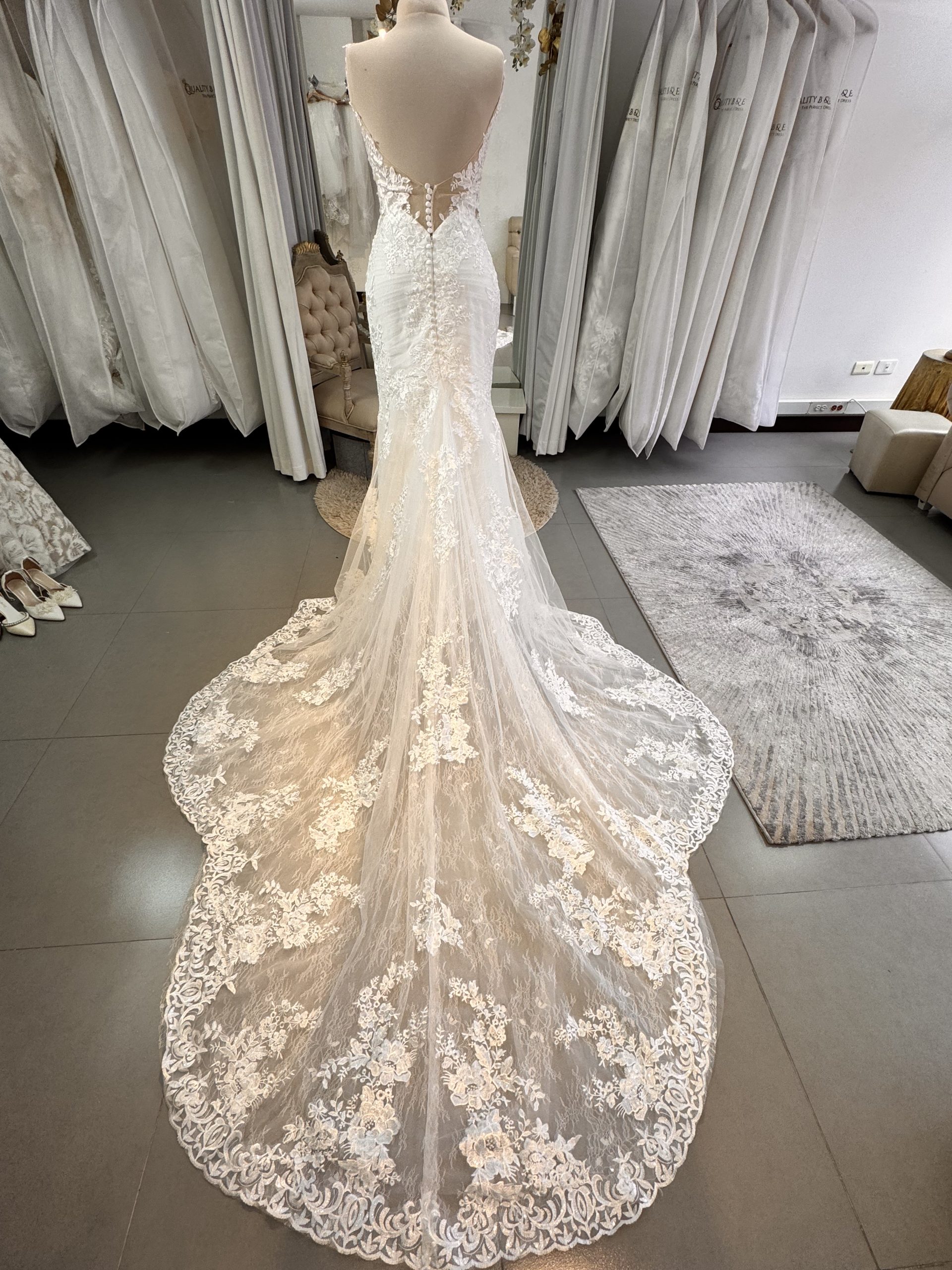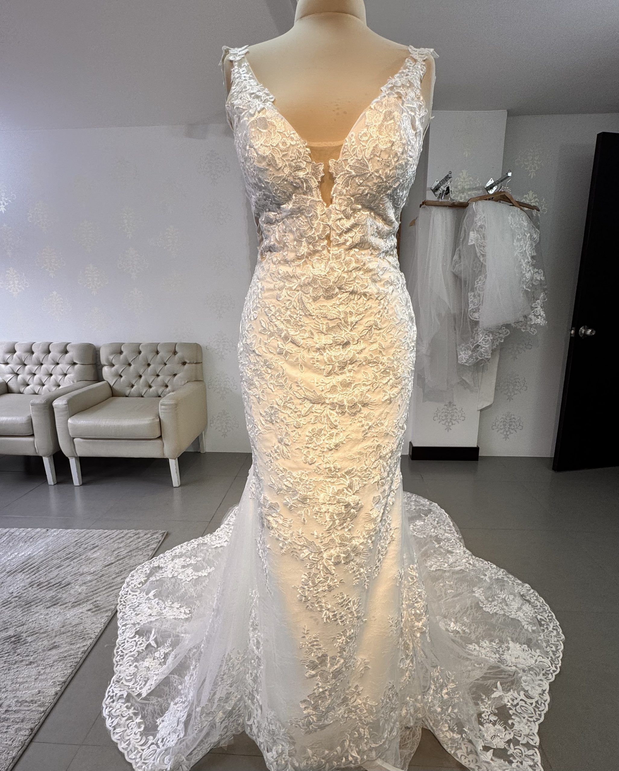 Vestido de Novia Estilo Sirena con Encajes y cuenta con hermosas y pequeñas lentejuelas en los encajes. Transparencia en Top y Cintura. Bellísimo tren de corte con una figura especial. Posibilidad de alteración al diseño por valor adicional.