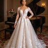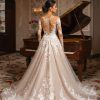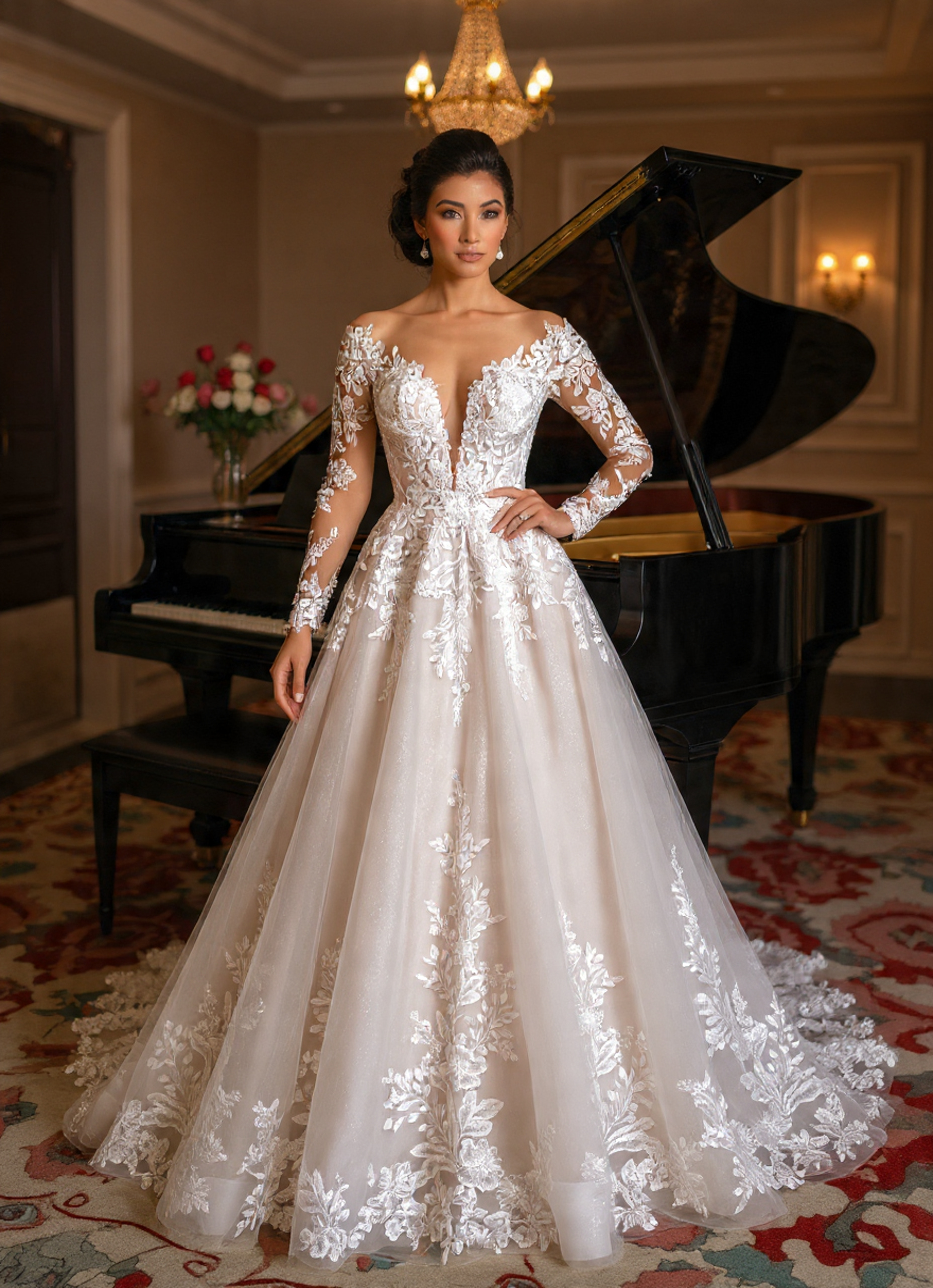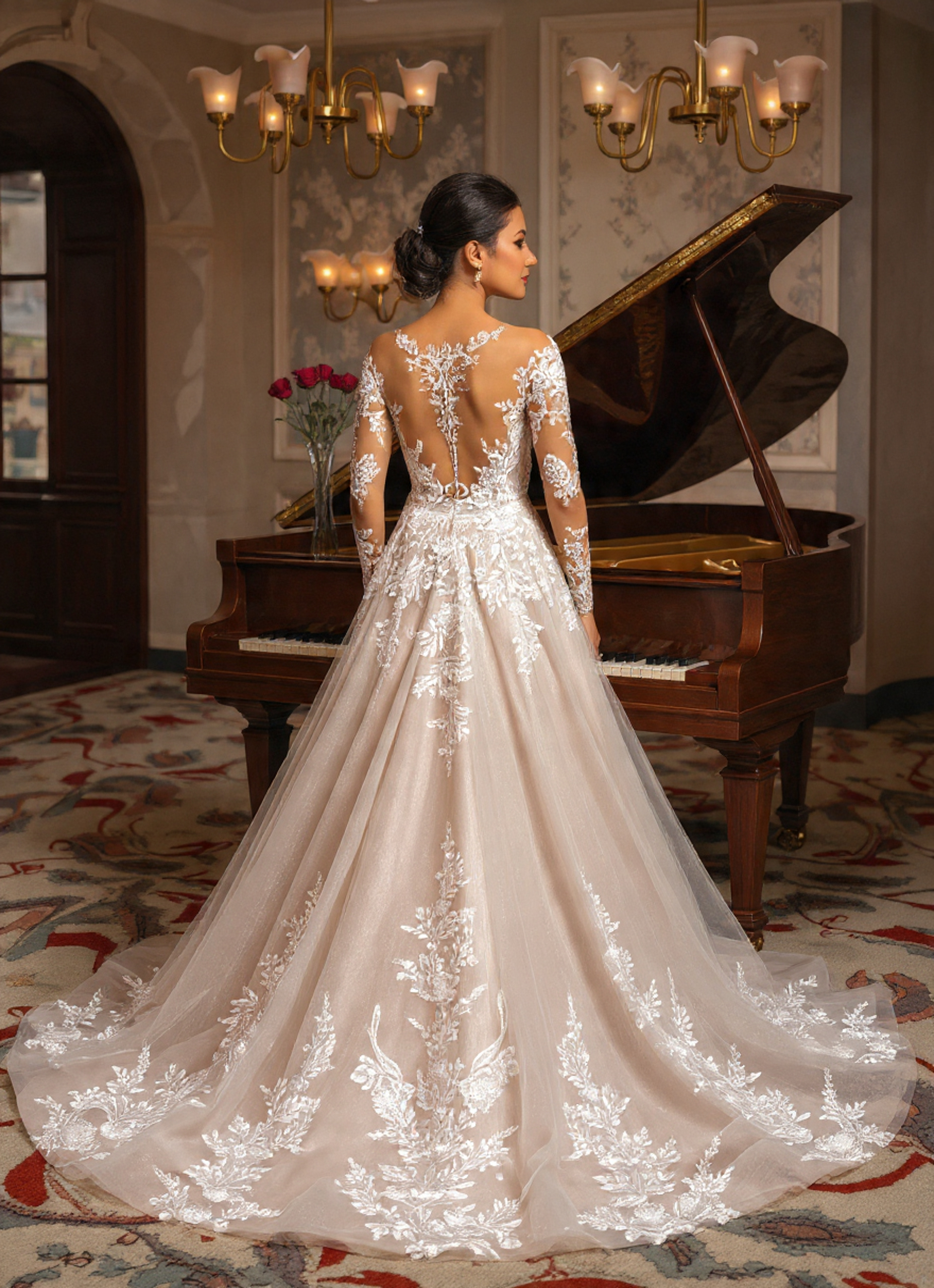 Vestido de novia corte en A, bellísimos encajes adornados adornando una falda con salida lisa desde la cintura. Tul interno brillante que te harán irradiar la alegría que llevas dentro. Manga larga que agrega elegancia y una espalda tipo ilusión con maravilloso encaje. Vestido de referencia para confección